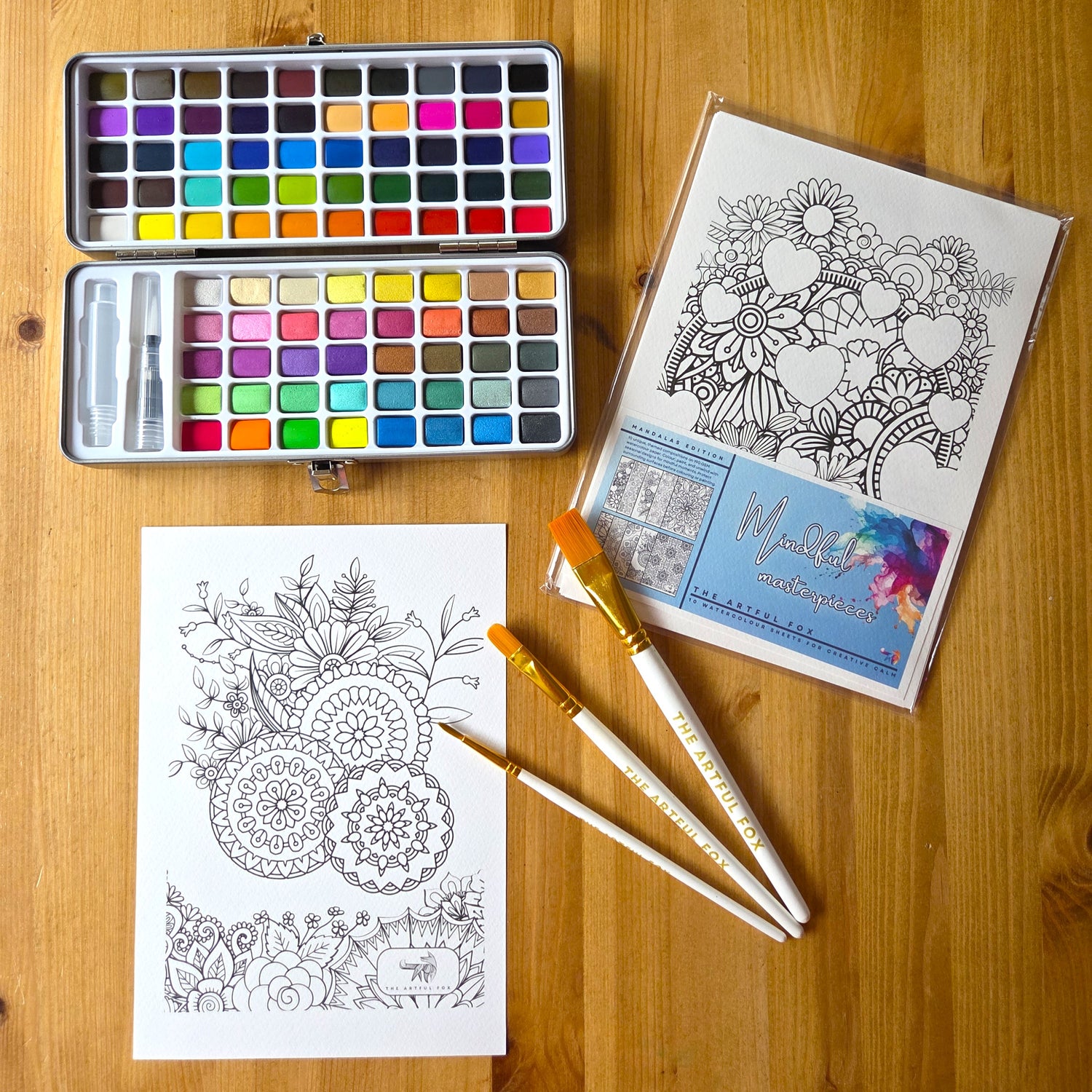 Watercolour paint set with 90 vibrant colours, in attractive travel tin. Includes refillable watercolour paintbrush! Perfect Christmas crafting gift for art lovers and creative kids by The Artful Fox
