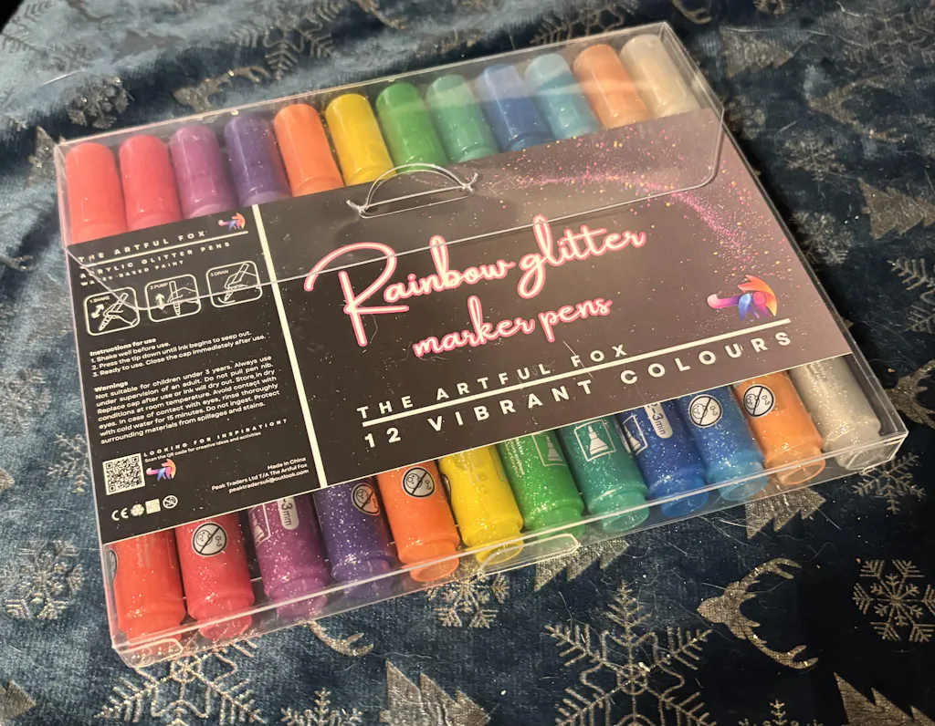 - 12 Bright, Glittery Colours: Experience the joy of creating with a spectrum of dazzling, rainbow-colored markers that shimmer and shine.